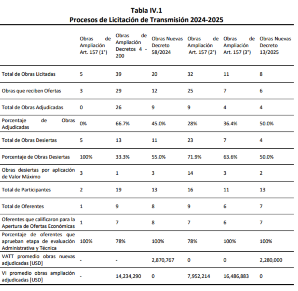 El informe del Coordinador indica que la alta tasa de procesos de licitaciones referidos a obras de transmisión declarados desiertos se debería a que “las obras de ampliación resultan adjudicadas a un valor mayor al referencial más frecuentemente que las obras nuevas” y, en 2024-2025, 92% de las obras de ampliación se adjudicó sobre el valor referencial, en algunos casos hasta “casi 7 veces” ese valor. Por eso, recomienda actualizar valores referenciales, incorporar fórmulas de indexación y definir valores de reserva conforme a costos vigentes. Véase Tabla IV.1., p. 63.