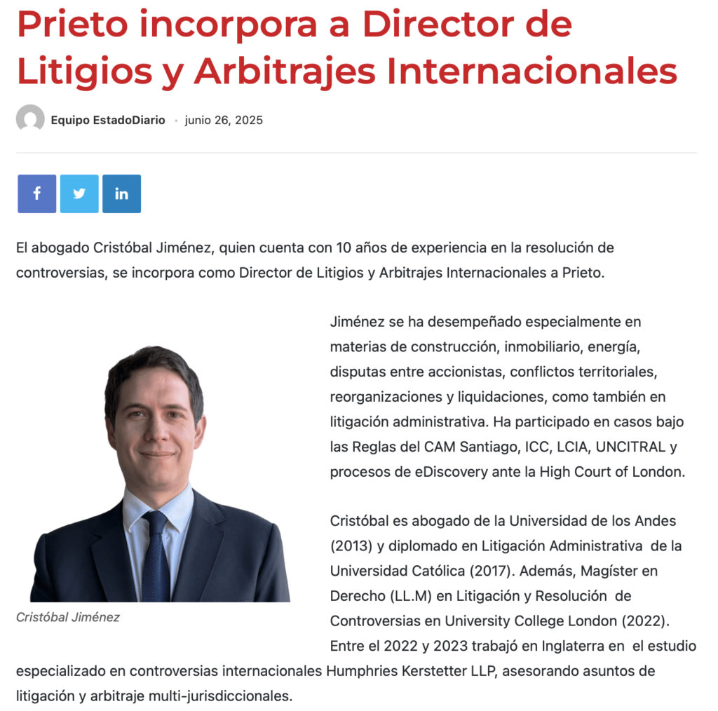 Prieto ficha a nuevo director para área de Litigios y Arbitrajes Internacionales